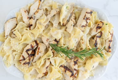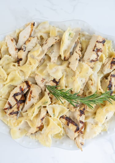 Grilled chicken with bowtie pasta topped with mushrooms, broccoli, and house alfredo sauce.