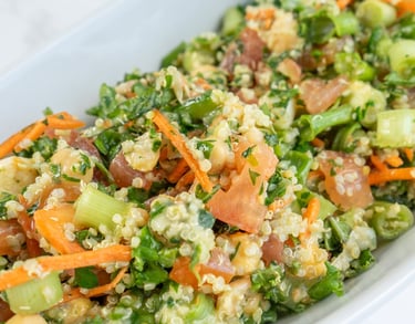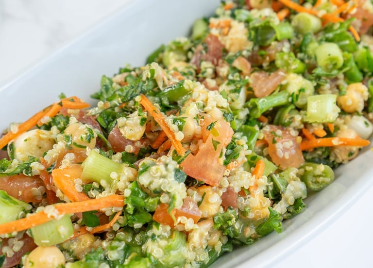 Quinoa, red onions, bell peppers, tomatoes, black olives, parsley, Bulgarian cheese, kale, Italian dressing