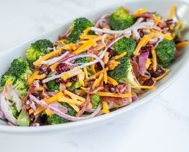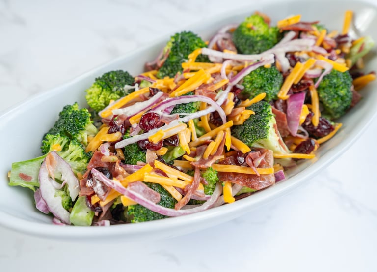 Broccoli, red onions, pine nuts, dried cranberry, turkey bacon, cheddar cheese, ranch dressing