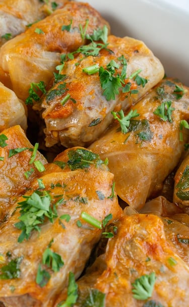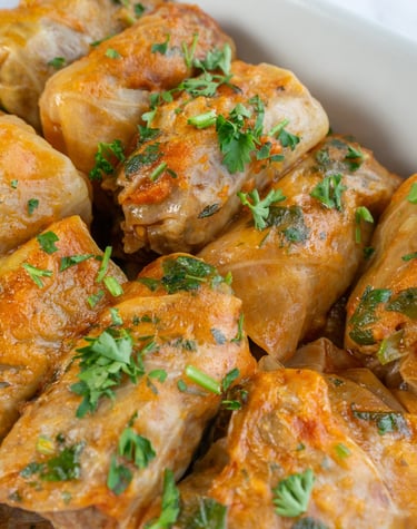 Ground beef, rice, and mixed vegetables rolled in a pickled cabbage, topped with house tomato sauce.