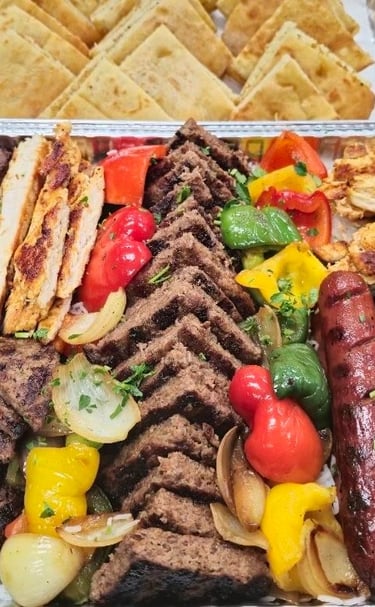 20 pieces of Cevapi, 5 Shish Cevapi, 2 Pljeskavice (Minced Meat Patties), 3 Hamburger patties, 2 Sliced Chicken Breasts, 2 Kielbasa, 3 Lepinje, Sliced Onions, served with a side of House Sauce